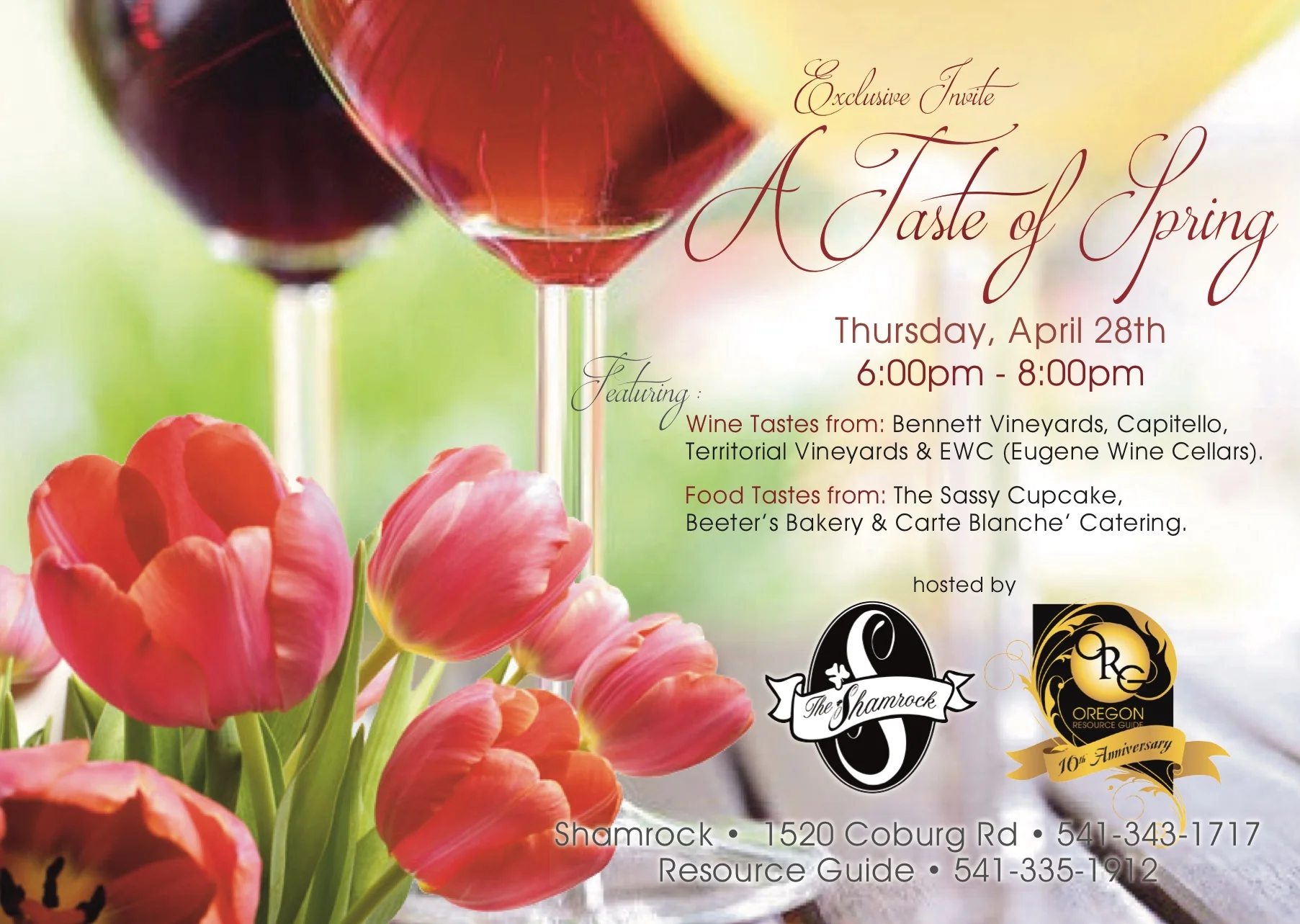 We'll be pouring our wines for this delicious open house at The Shamrock Flowers & Gifts in Eugene. With wine and food tastes from Bennett Vineyards, Capitello, Territorial Vineyards, Eugene Wine Cellars, The Sassy Cupcake, Beeter's Bakery and Carte Blanche Catering.