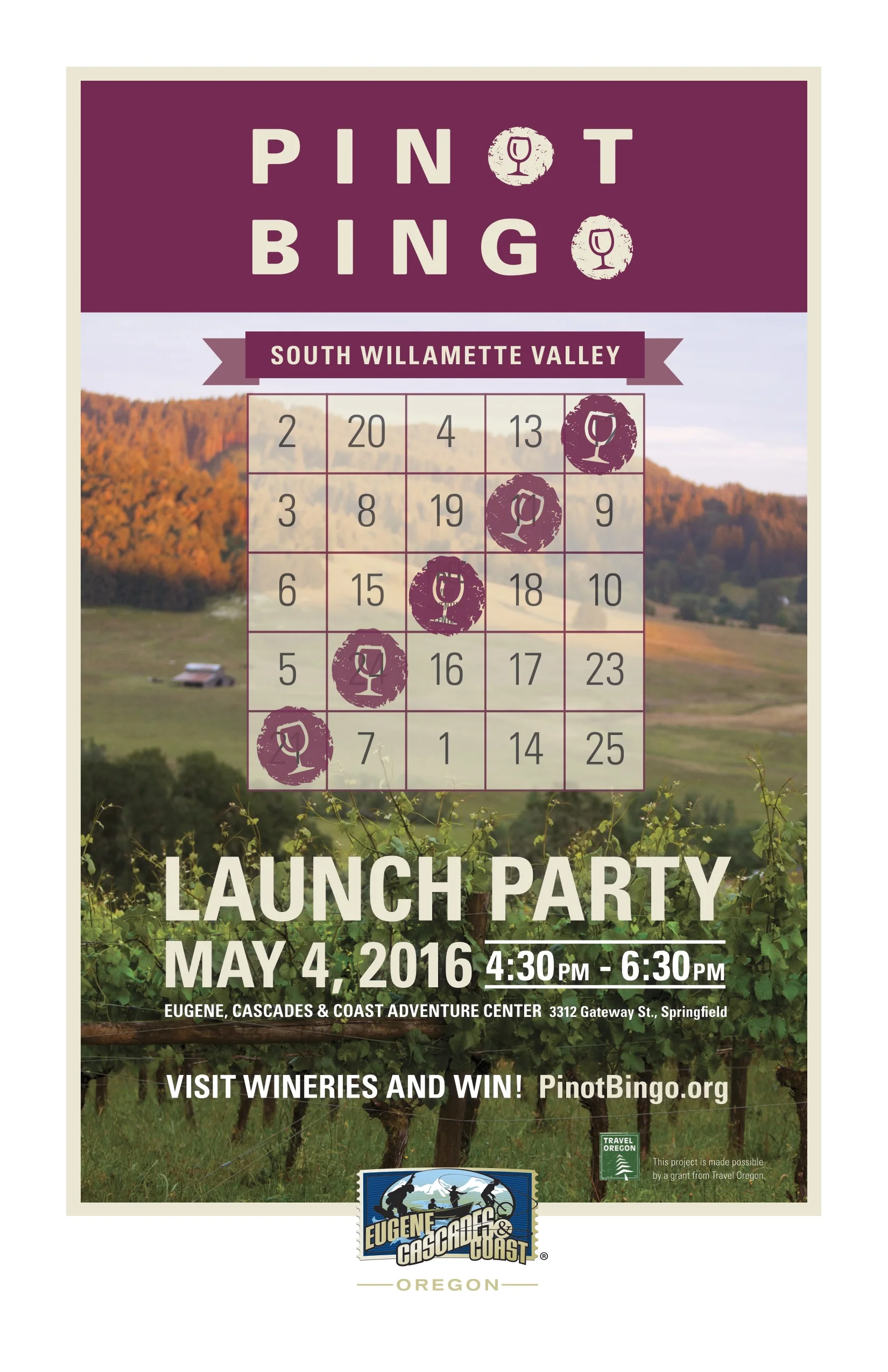 Get ready for Pinot Bingo! Earn fun prizes and explore South Willamette Wineries with this brand new program. Help kick it off at the Pinot Bingo launch party at the Eugene, Cascades & Coast Adventure Center. After the launch party, Pinot Bingo cards will be available for pickup at participating wineries, pairings location, the Visitor Center and Adventure Center. Happy adventuring!